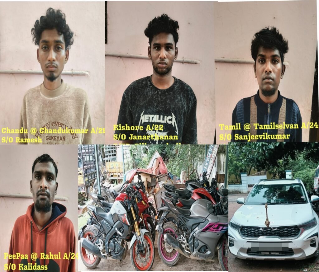 விழுப்புரம் மாவட்டம் கடந்த சில மாதங்களாக ஆரோவில் காவல் நிலைய எல்லைக்கு உட்பட்ட கோட்டகுப்பம், கிளியனூர், பகுதிகளில் இருசக்கர வாகனங்கள் களவு போய்க்கொண்டிருந்த நிலையில் குற்றவாளிகள் போலீசாரால் தீவிரமாக தேடப்பட்டு வந்தனர். இந்நிலையில் விழுப்புரம் மாவட்ட காவல் கண்காணிப்பாளர் சரவணன் அவர்களின் உத்தரவின் பேரில் கோட்டகுப்பம் துணை காவல் கண்காணிப்பாளர் திருமதி உமாதேவி அவர்களின் மேற்பார்வையில் ஆரோவில் காவல் நிலைய ஆய்வாளர் திருமால், உதவி ஆய்வாளர் மணிமாறன் தலைமையில் காவலர்கள் திருச்சிற்றம்பலம் கூட்ரோடு அருகே திண்டிவனம் வழி பாண்டி மார்க்கமாக வாகன தணிக்கையில் தீவிரமாக ஈடுபட்டு இருந்தபோது அந்த வழியாக வேகமாக அடுத்தடுத்து வந்த கார் மற்றும் இருசக்கர வாகனங்களை நிறுத்தி விசாரணை மேற்கொண்டனர் வாகனங்களில் வந்தவர்கள் முன்னுக்குப் பின் முரணாக பதிலளிக்க அவர்களை காவல் நிலையம் அழைத்து வந்து போலீசார் விசாரணை செய்ததில் 1.தமிழ் என்கிற தமிழ்ச்செல்வன் வயது 24 தந்தை பெயர் சஞ்சீவ் குமார், அம்பேத்கர் தெரு முருங்கை கிராமம் மரக்காணம் தாலுக்கா, 2.கிஷோர் வயது 22 தந்தை பெயர் ஜனார்த்தன பிள்ளையார் கோவில் தெரு அம்மணம் பாக்கம், திண்டிவனம், 3.ராகுல் வயது 24 தந்தை பெயர் காளிதாஸ் ஒலக்கூர் மெயின் ரோடு வைரபுரம் திண்டிவனம், 4.சந்து என்கிற சந்துகுமார் வயது 21 தந்தை பெயர் ரமேஷ் பிள்ளையார் கோவில் தெரு அம்மணம்பாக்கம், திண்டிவனம், என்பது தெரிய வந்தது இவர்கள் இரவு நேரங்களில் காரில் வீட்டில் வெளியே தனியாக இருக்கும் இரு சக்கர வாகனங்களை நோட்டமிட்டுச் சென்று களவு செய்ததாகவும், திருடிச் சென்ற வாகனங்களை விற்பனை செய்து அதன் மூலம் வந்த பணத்தைப் பெற்று வெளியூர்களுக்கு சுற்றுலா சென்று இன்ப வாழ்க்கை வாழ்ந்து வந்ததும் தெரியவந்தது.இவர்கள் 4 பேரும் புதுச்சேரி சென்று திரும்பும் போது போலீசாரிடம் பிடிபட்டனர்.4 பேரையும் கைது செய்து அவர்களிடமிருந்து 9 இருசக்கர வாகனங்கள் குற்றத்திற்கு பயன்படுத்திய கார் ஆகியவை பறிமுதல் செய்யப்பட்டது குற்றவாளிகளை நீதிமன்ற காவலுக்கு கொண்டு செல்ல நடவடிக்கை மேற்கொண்டு வருகின்றனர்.